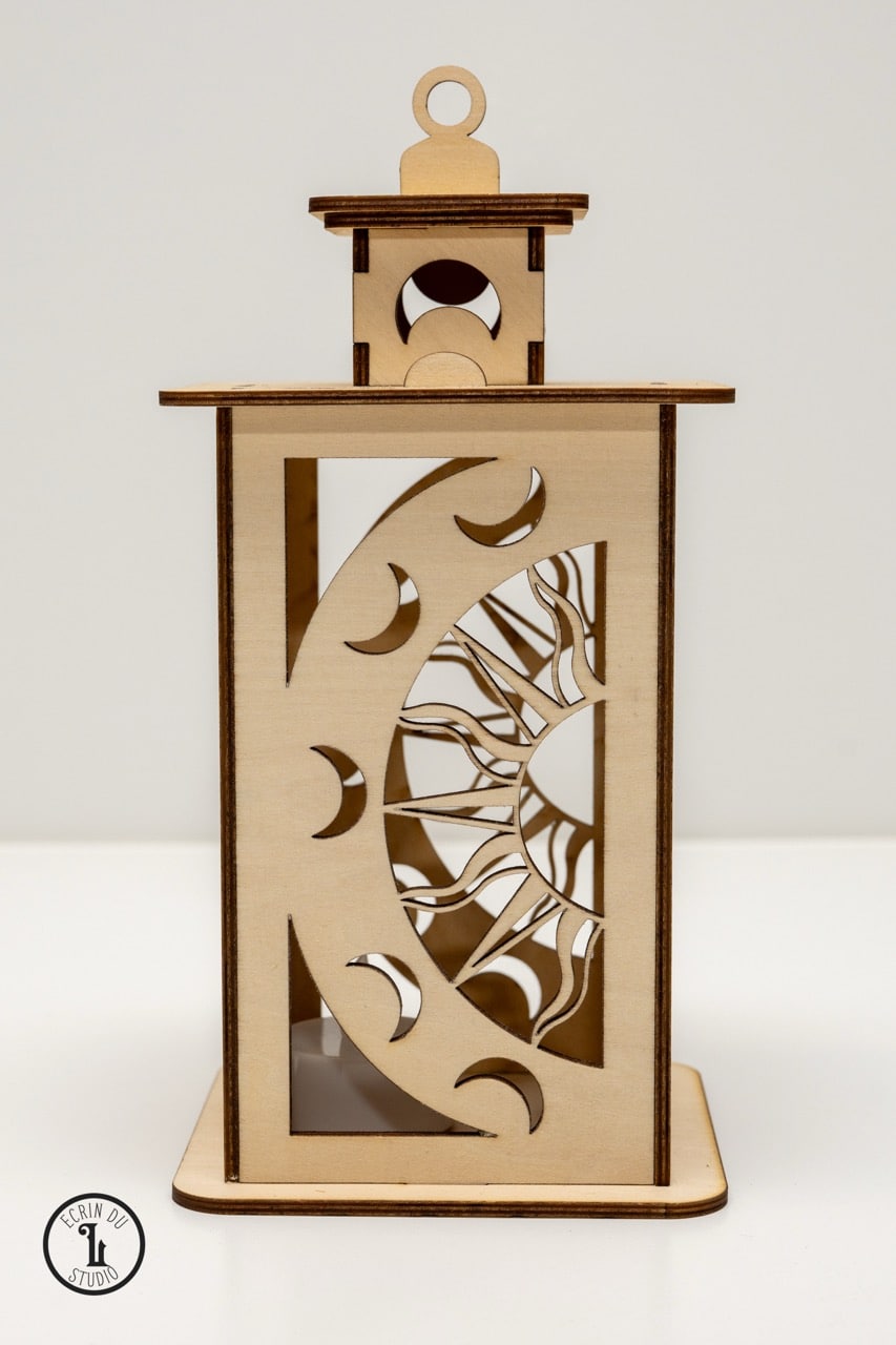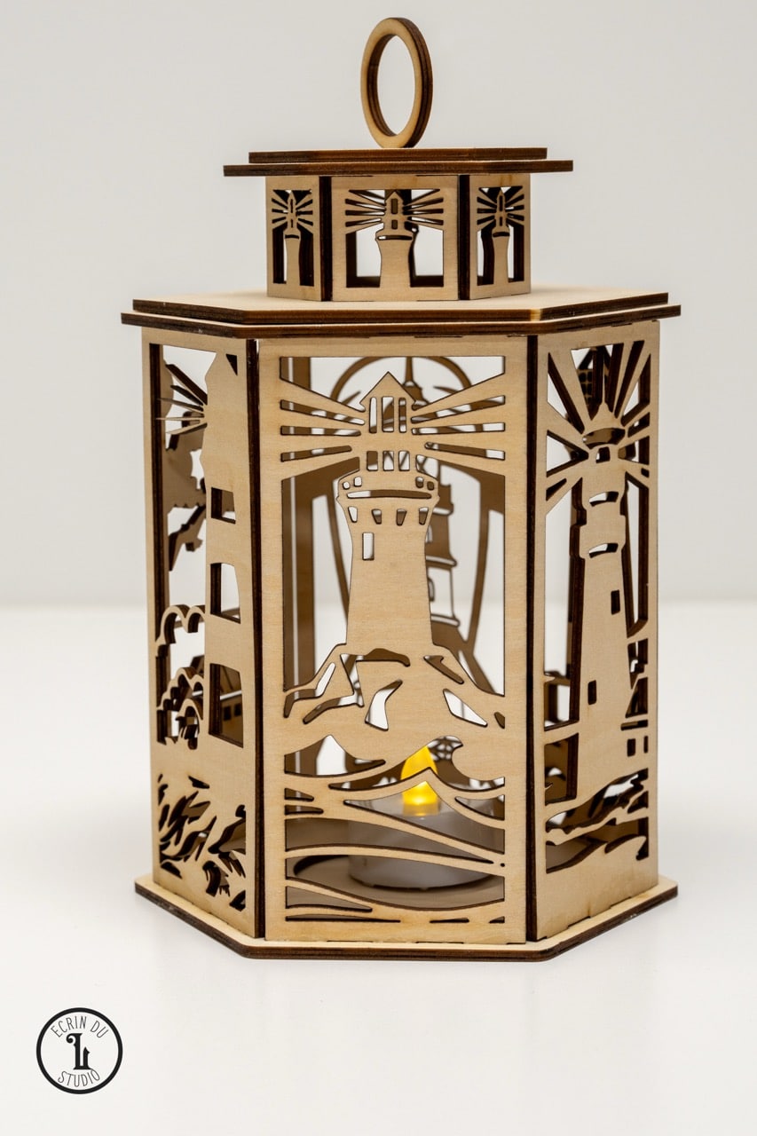 Réalisée en bois clair naturel, cette lanterne se distingue par la précision de sa découpe laser et la pureté de ses lignes. Elle peut accueillir une bougie LED, une guirlande lumineuse, ou simplement être utilisée comme objet décoratif.